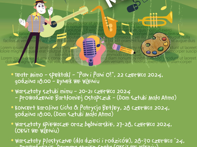 Warsztaty muzyczne odbywać się będą w OKSiT we Wleniu 27 czerwca (14.00 – 16.00) i 28 czerwca (12.00-14.00) . Od piątku, 28 czerwca, trwać będą natomiast trzydniowe rodzinne warsztaty plastyczne, które każdego dnia będą miały inny temat, każdego dnia odbywać się jednak będą w godz. od 12.00 do 14.00). W piątek, 28 czerwca, zapraszamy więc do siedziby OKSiT na warsztaty podczas których powstawać będą zdobione szkatułki. W sobotę, 29 czerwca, już w plenerze, czyli w parku Pałacu Książęcego we Wleniu odbywać się będą warsztaty malarstwa sztalugowego. W niedzielę, 30 czerwca, przyjdzie czas na malowane torby.