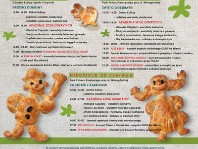 W sobotę i niedzielę 29 i 30 czerwca Akademia Sztuk Odkrytych odbywać się będzie w plenerze. Zarówno warsztaty kulinarne z wypiekiem wleńskich ciaptaków, warsztaty dekorowania obrusów oraz tworzenie lokalnej księgi kucharskiej usytuowane będą w Parku Pałacu Książęcego. Na wszystkich zainteresowanych czekamy w godzinach 14.00 -18.00 w sobotę i 14.00 - 17.00 w niedzielę. A po zajęciach twórczych czekają nas wydarzenia muzyczne.