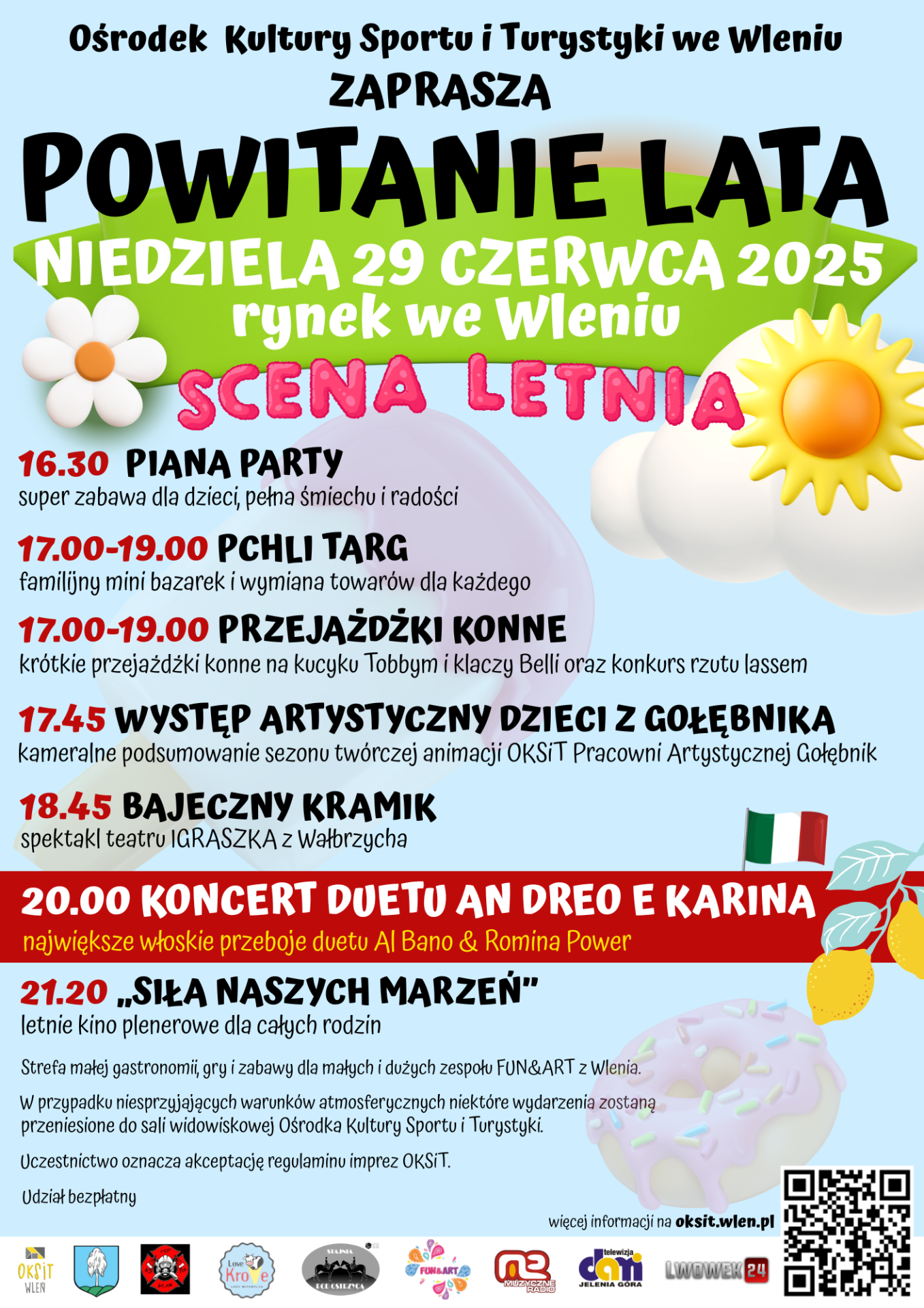 W niedzielę 29 czerwca 2025r. na urokliwym rynku miasta Wleń, w rodzinnym i przyjacielskim gronie oficjalnie przywitaliśmy lato. Wydarzenie zorganizowane przez Ośrodek Kultury Sportu i Turystyki we Wleniu było pełne różnorodnych atrakcji i animacji dla uczestników w każdym wieku. Spędziliśmy czas pełen emocji, dobrej zabawy i niecodziennych wrażeń.