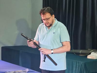 Spotkanie otworzyło wystąpienie Pawła Nowaczyka - członka Towarzystwa Zachowania Miecza Japońskiego z siedzibą w Tokio oraz podróżnika szlakiem miecza japońskiego, który opowiedział zebranym o historii miecza i jego istocie w japońskiej kulturze.