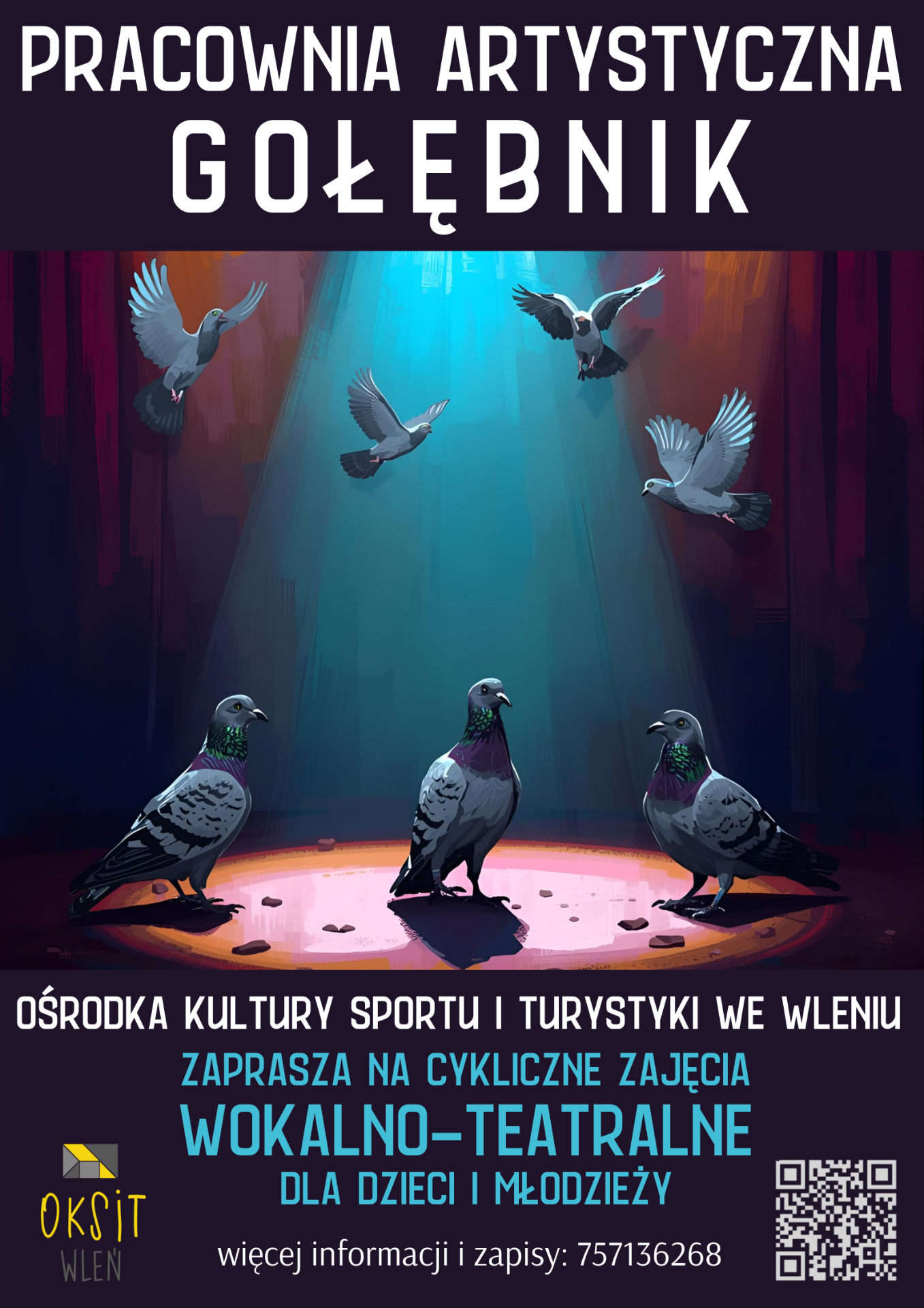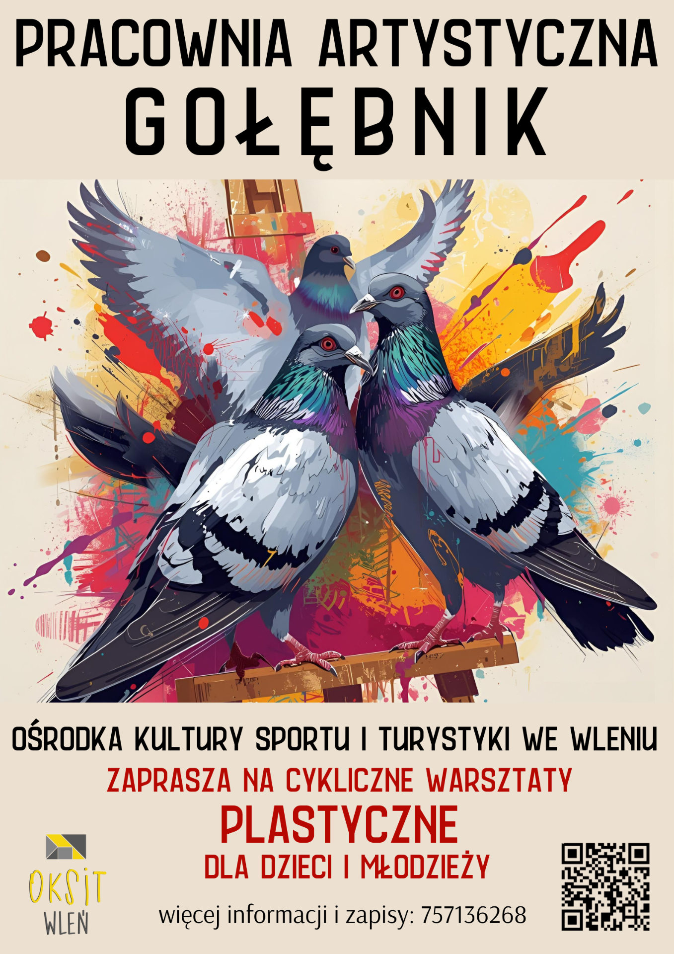 Od października 2025 r. Ośrodek Kultury Sportu i Turystyki we Wleniu z radością zaprasza dzieci i młodzież do udziału w cyklicznych zajęciach pracowni artystycznej „Gołębnik”. Przygotowaliśmy dla Was specjalny program cotygodniowych zajęć twórczych tak, aby każdy mógł odkryć swoje talenty i znaleźć przestrzeń do wyrażania siebie. Masz pasje, które chcesz rozwijać? A może szukasz nowego hobby lub sposobu na spędzenie czasu po szkole? To są właśnie zajęcia dla Ciebie!