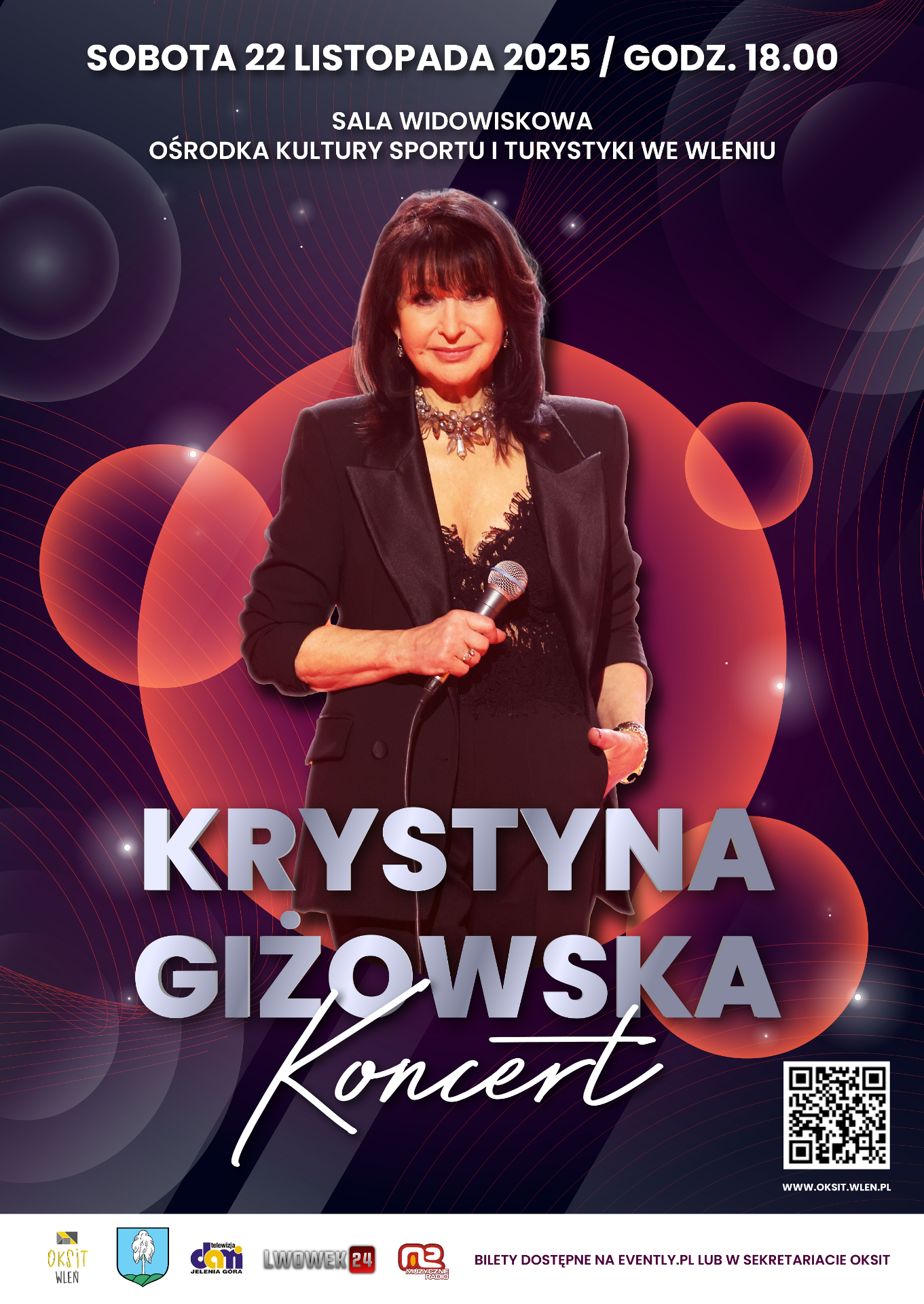 Gorąco zapraszamy do udziału w wyjątkowym i nastrojowym koncercie Krystyny Giżowskiej, który odbędzie się w sali widowiskowej Ośrodka Kultury Sportu i Turystyki we Wleniu w sobotę 22 listopada 2025 r. o godz. 18.00. Artystka zaprezentuje swoje największe przeboje, które znane są polskiej publiczności od wielu lat.