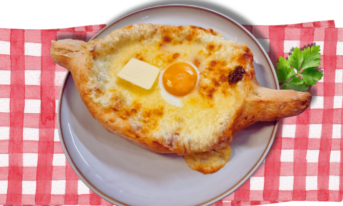 Następnym przystankiem będzie Gruzja. Chaczapuri to placek zapiekany z serem a tym samym jedno z tradycyjnych dań kuchni kaukaskiej. Występuje w licznych, różniących się od siebie odmianach. My przygotujemy wersję z żółtkiem i masełkiem. Gruziński chlebek śmiało można podawać też z jogurtem naturalnym lub sosami.