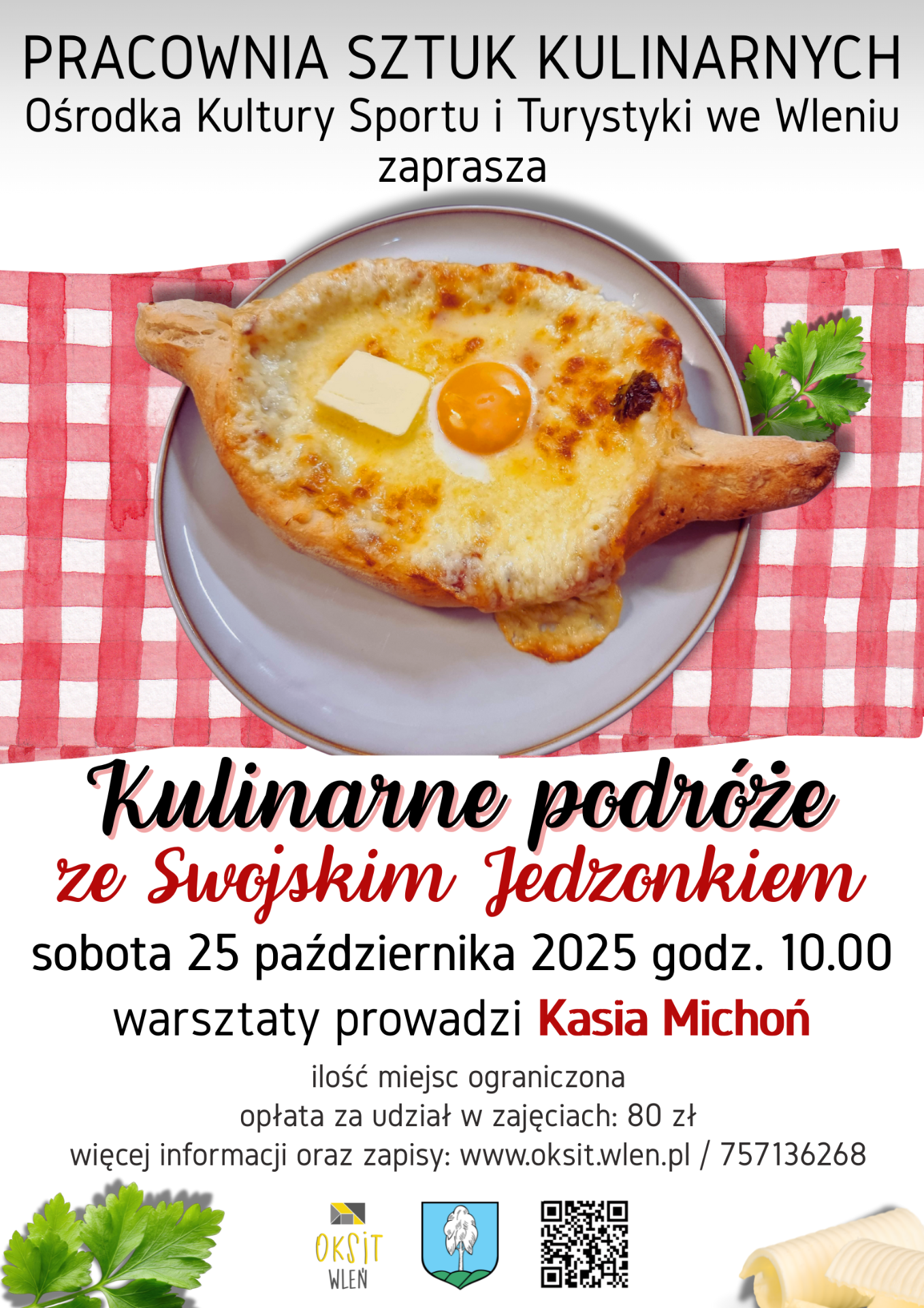 Warsztaty kulinarne w OKSiT Wleń prowadzi Katarzyna Michoń, która od wielu lat z powodzeniem prowadzi bloga kulinarnego oraz kanał na platformie youtube pn.: „Swojskie Jedzonko”. O swojej pasji mówi: Gotowanie to coś, co kocham i co sprawia mi ogromną radość. Moje przepisy są przekazywane w przystępny i prosty sposób, tak żeby każdy mógł przygotować je później samodzielnie w domu.
