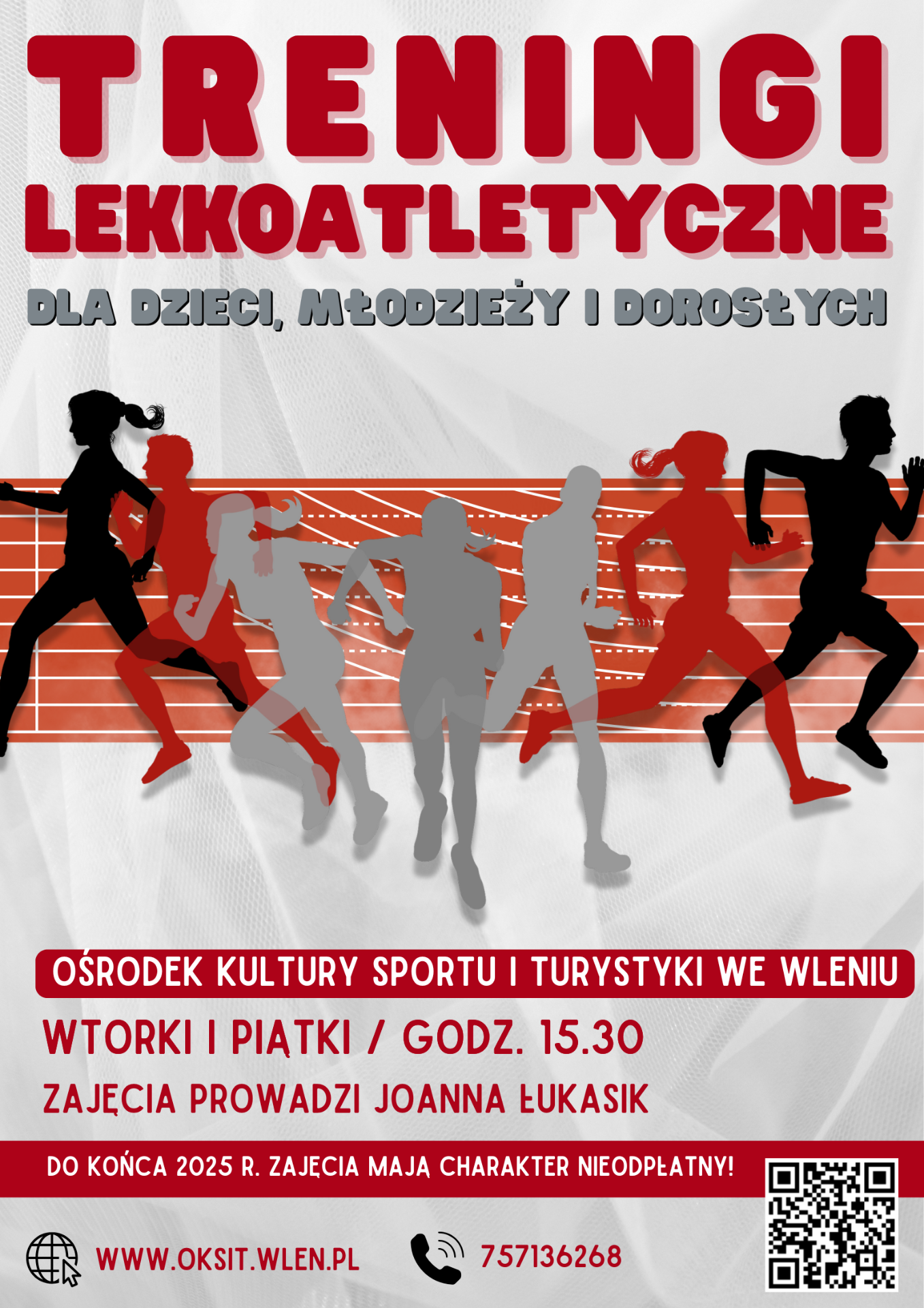 Serdecznie zapraszamy wszystkie chętne dzieci od 8. roku życia, młodzież oraz rodziców do udziału w cyklicznych treningach lekkoatletycznych we Wleniu. Zajęcia odbywają się dwa razy w tygodniu – we wtorki i piątki w godzinach 15:30–17:00. Do końca roku 2025 udział w zajęciach ma charakter nieodpłatny.