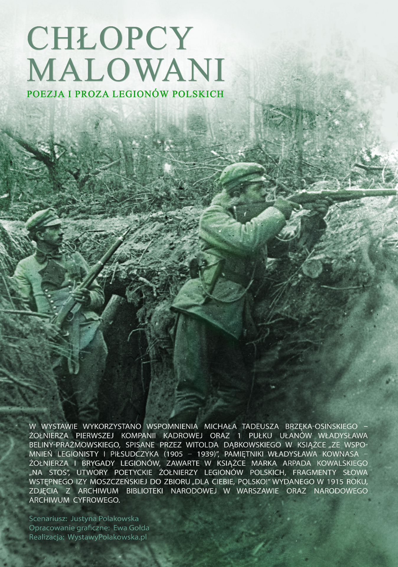 Od godz. 15.00 w holu tut. domu kultury, dla zwiedzających będzie udostępniona wystawa pn. „Chłopcy malowani” oparta na tekstach poetyckich stworzonych w okopach oraz wspomnieniach piłsudczyków. W utworach tych znajdziemy nadzieje związane z wyzwoleniem Polski, ale i dopadające żołnierzy zwątpienie. Poetyckie uwielbienie Ojczyzny staje obok prozy koszarowego życia zniechęcającego niedostatkami. Motywacja do walki miesza się z żalem za utraconą młodością z jej radosnymi przywilejami. W poezji i prozie legionistów czytamy o bliskości śmierci, z którą żołnierze radzili sobie na różne sposoby – przypominaniem sensu poświęcenia, albo ucieczką w drwinę i żart. Wystawa składa się z 15 plansz z archiwalnymi zdjęciami przedstawiającymi okopowe życie polskiego żołnierza podczas I wojny światowej i prezentowana będzie w holu OKSiT do końca listopada br.