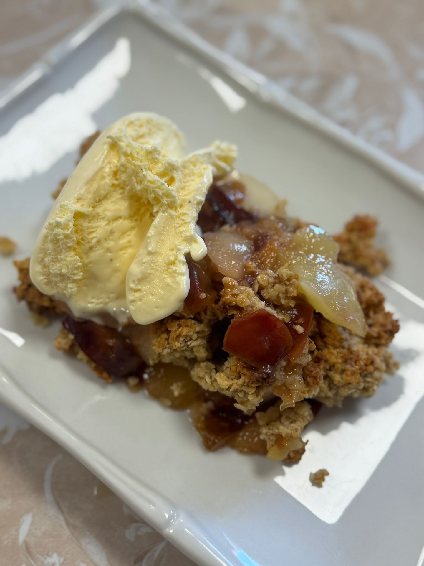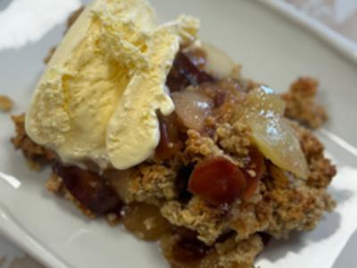 Przerwy we wspólnym przygotowywaniu dań mijały nie mniej przyjemnie – na rozmowach przy stole, kosztując przyrządzonych specjałów. Przyszedł czas na deser. Wybór padł na angielskie crumble czyli owoce zapiekane pod kruszonką, w obstawie lodów waniliowych. Ze względu na porę roku, dobór owoców był oczywisty. W menu królowały gruszki i śliwki, które po upieczeniu zyskiwały wyjątkowego charakteru.