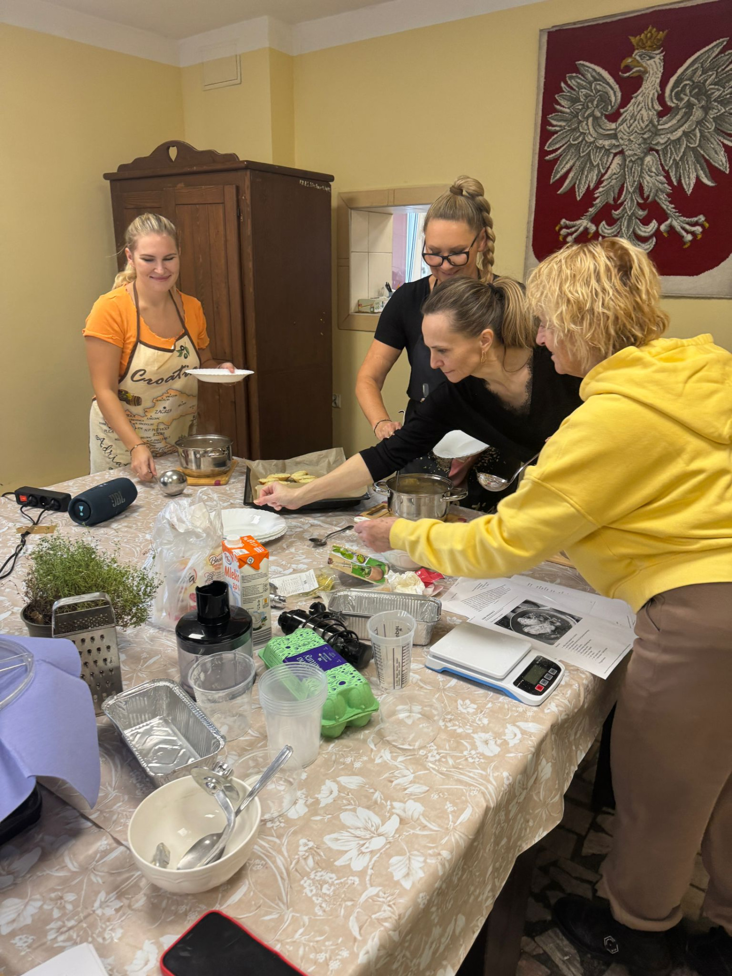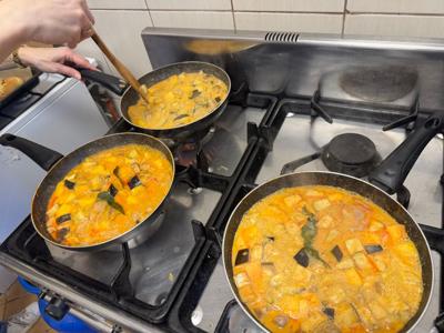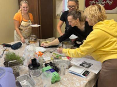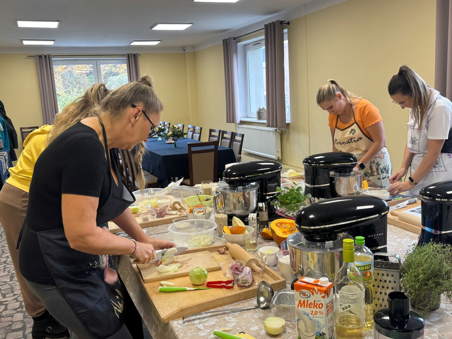 Na stole królowała zupa cebulowa rodem z Francji, podawana z serowymi grzankami jako dodatkiem. Gruzińskie chaczapuri rozpływało się w ustach. W ruch poszły roboty planetarne Mozano – firmy będącej partnerem naszych warsztatów. Kaukaskie chlebki były serwowane z żółtkiem i masłem. Następnie kuchnię Ośrodka Kultury Sportu i Turystyki wypełnił zapach tajskiego curry z dodatkiem dyni i polędwiczek wieprzowych. Wyrazistości nadał imbir i czosnek w odpowiednich proporcjach.