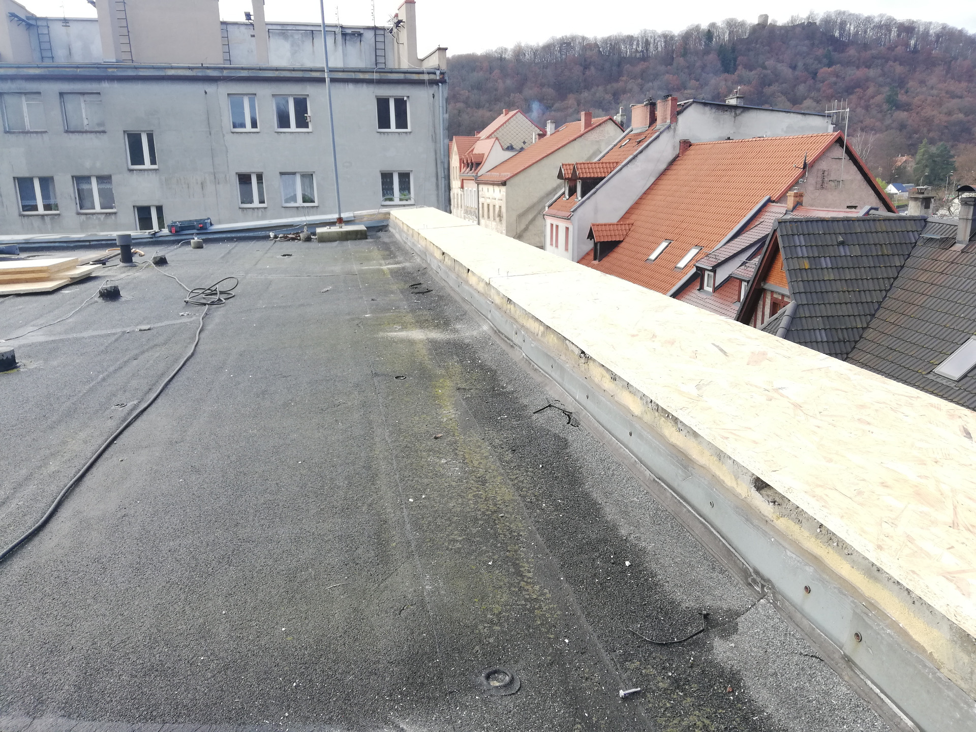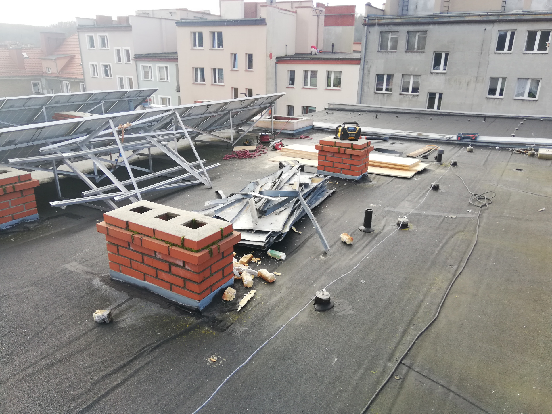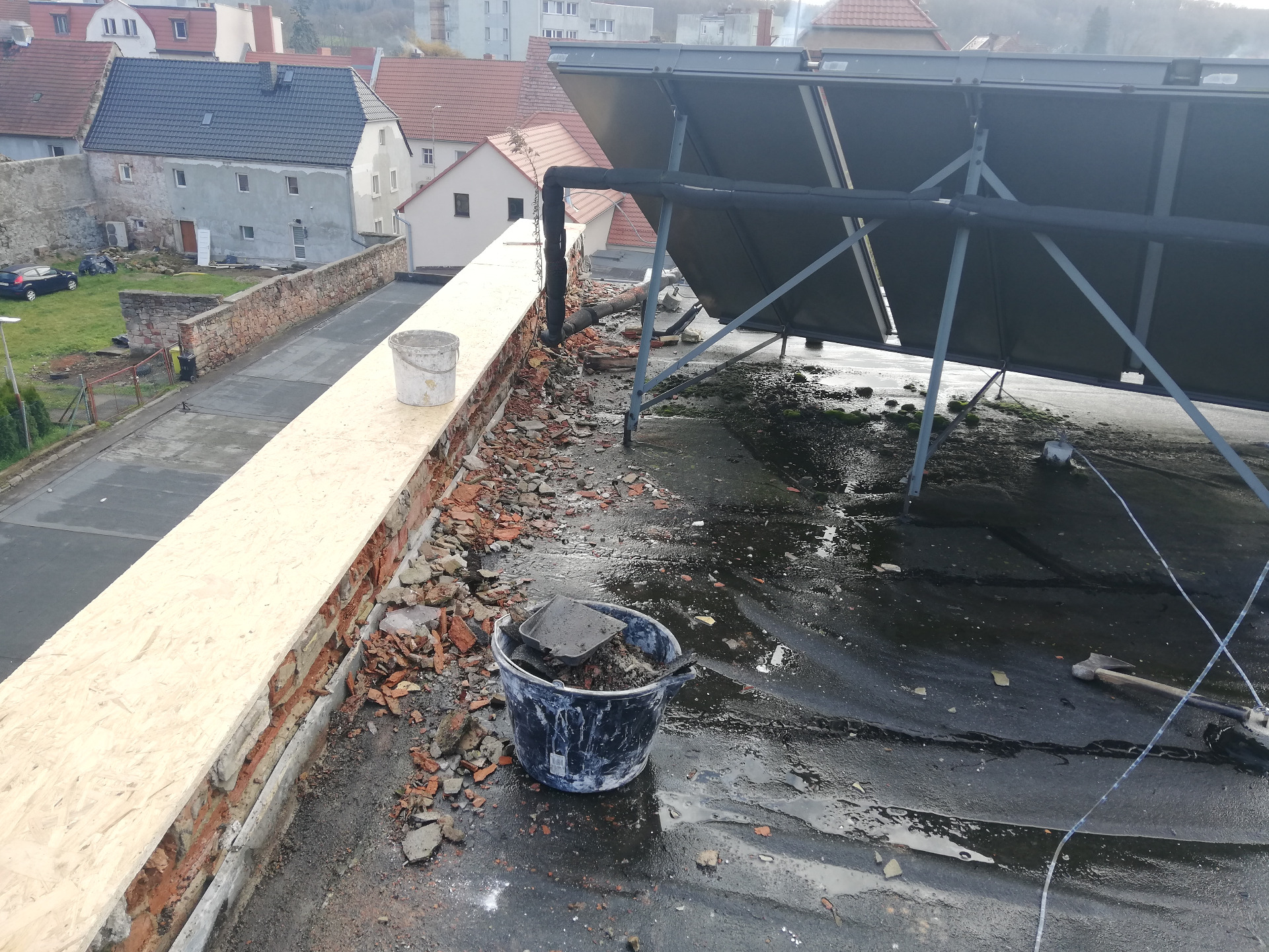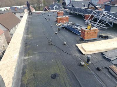 W połowie listopada 2025r. rozpoczęliśmy remont części dachu na budynku tut. ośrodka. Wiele lat postępującej korozji ogniomurów, ubytków papy termozgrzewalnej i obróbek blacharskich, spowodowało przedostawanie się wody do pomieszczeń poniżej. To skutkowało zawilgoceniem ścian oraz obsypywaniem się tynków, co całkowicie spowodowało wyłączenie drugiego piętra z użytkowania. Po zakończeniu prac dekarskich planujemy rozpocząć remonty pokoi i pomieszczeń poniżej, przygotowując je pod zajęcia warsztatowe, sportowe a także nadając im funkcję przestrzeni magazynowych.