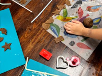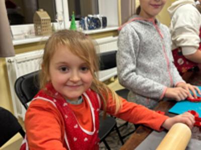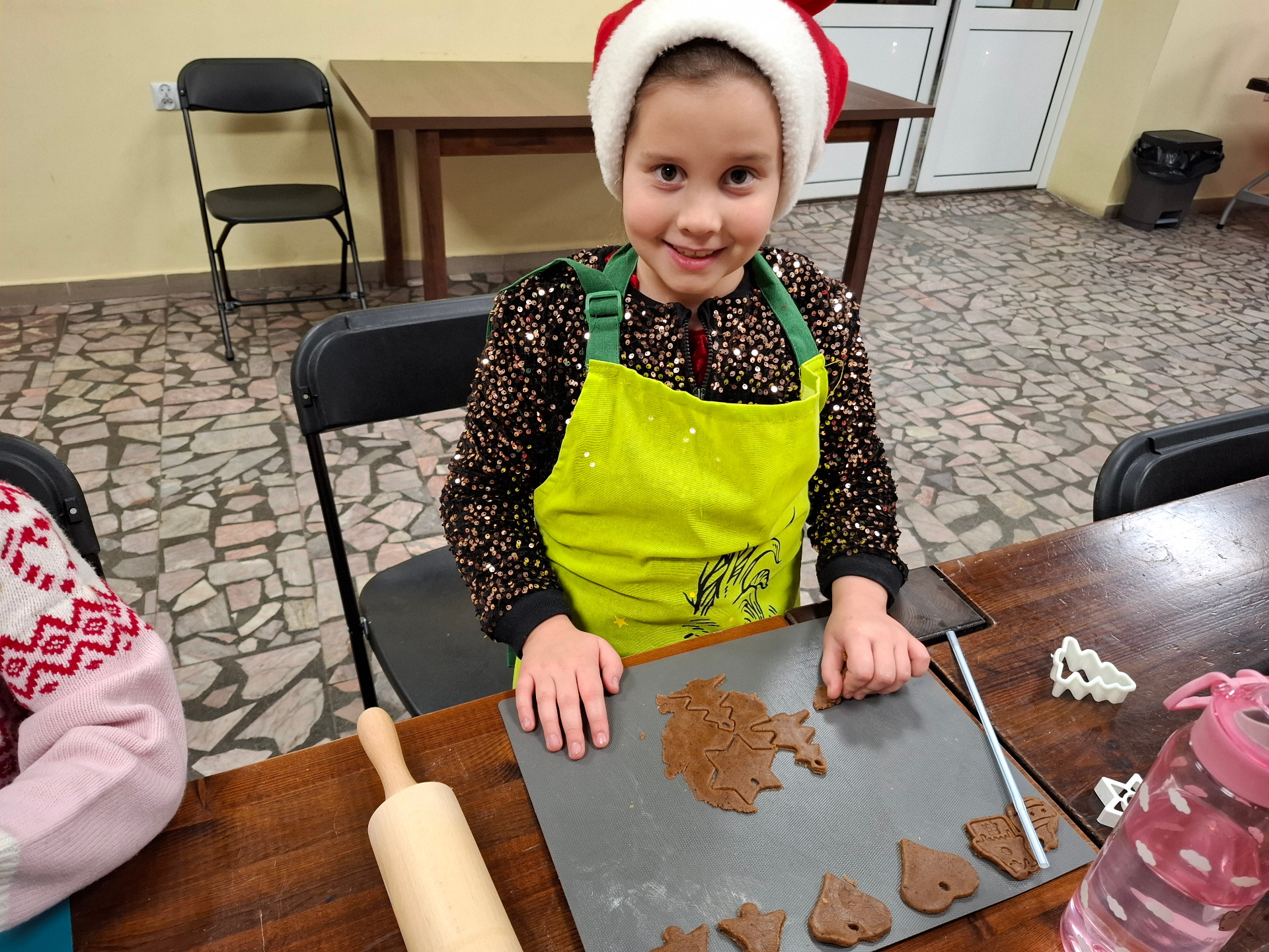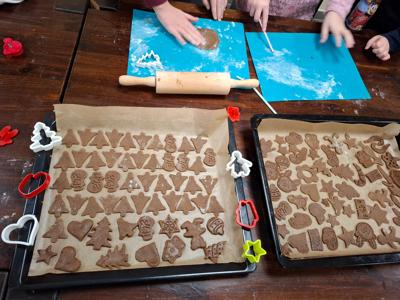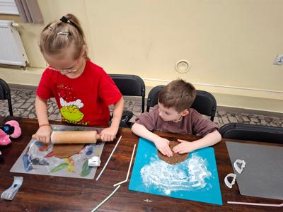 Po dokładnym rozwałkowaniu przygotowanego ciasta do pożądanej grubości przyszedł czas na wyciskanie pierników z użyciem różnorodnych foremek. Do wyboru mieliśmy ich wiele, niektórzy przynieśli też swoje ulubione. Wycięte ciasteczka piernikowe trafiły do piekarnika. W tym czasie zaprosiliśmy naszych gości na seans w Kinie Jutrzenka we Wleniu. Na ekranie pojawił się dzielny Renifer Niko ratujący sanie Świętego Mikołaja, które znalazły się w niezłych tarapatach.