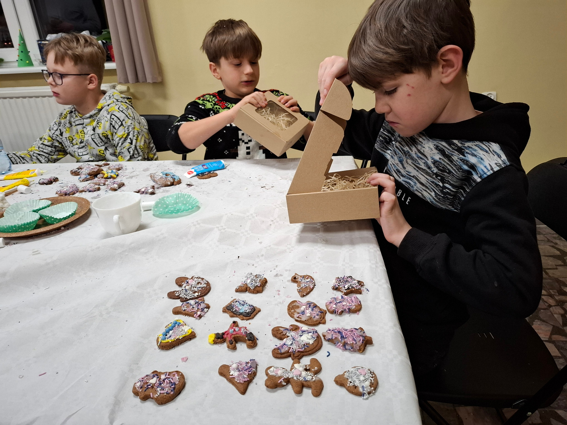 Udekorowane pierniczki zostały zapakowane w kartonowe pudełka, by stać się wspaniałą, jadalną pamiątką, prezentem dla bliskich lub ozdobą choinkową. Oczywiście, część z nich została skonsumowana na miejscu, co było słodkim zakończeniem naszych zajęć.