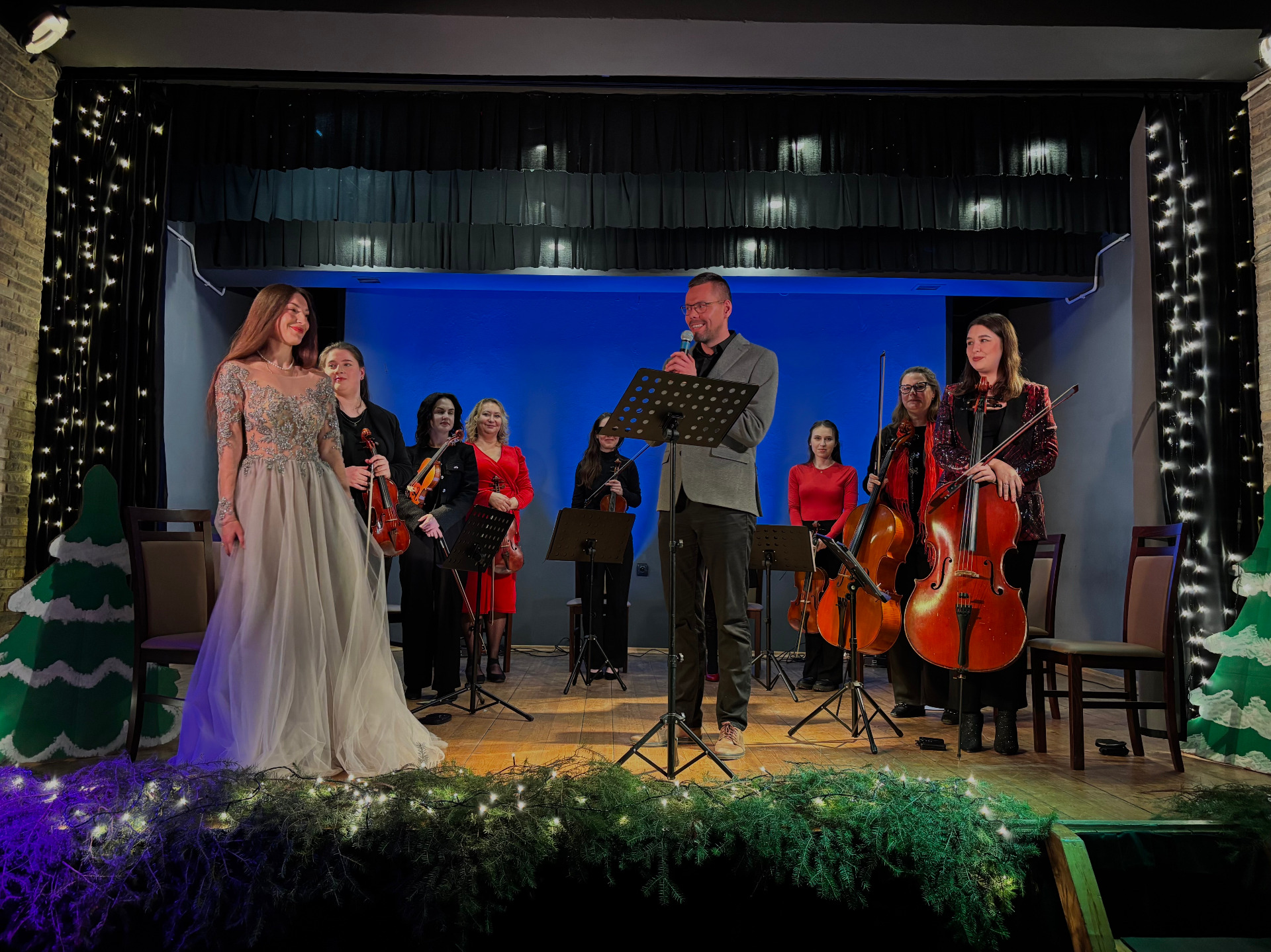 Na scenie wystąpiła Wrocławska Orkiestra Kameralna – niezwykły zespół złożony wyłącznie z kobiet grających na instrumentach smyczkowych. Subtelne, pełne harmonii brzmienie skrzypiec, altówek i wiolonczel stworzyło nastrojowe tło dla całego wieczoru. Szczególnym punktem koncertu był występ sopranistki Marii Datskovej, której piękny, czysty głos poruszał serca i wprowadzał słuchaczy w prawdziwie świąteczny nastrój.