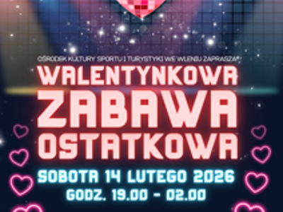 Serdecznie zapraszamy na walentynkową zabawę taneczną, która odbędzie się w sobotę 14 lutego 2026 r. w Ośrodku Kultury, Sportu i Turystyki we Wleniu. To już kolejna okazja dla wszystkich, którzy lubią dobrą muzykę i taneczną atmosferę. Wydarzenie jest propozycją dla osób pełnoletnich, spragnionych świetnej zabawy. W programie znajdą się również zabawy karnawałowe z nagrodami. Będzie się działo!