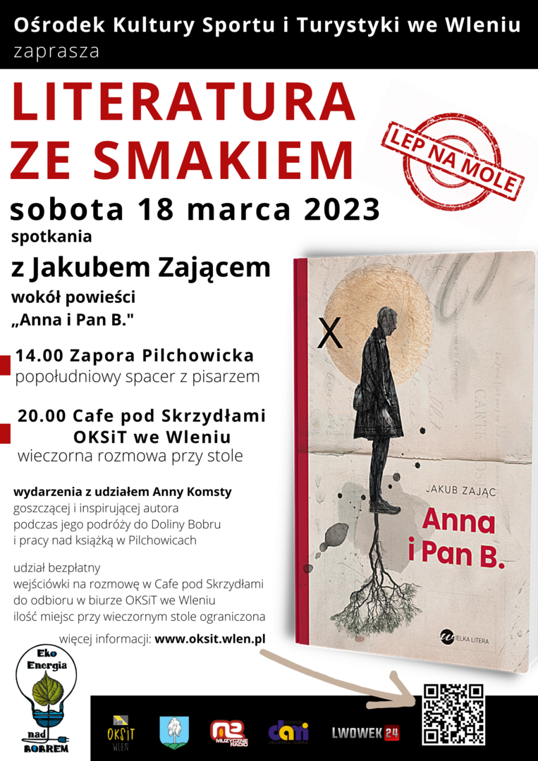 Zapraszamy na niezwykłą rozmowę z Jakubem Zającem, który przy stole w Cafe pod Skrzydłami opowiadał będzie o swojej książce „Anna i Pan B.”. Wieczorne spotkanie Ośrodku Kultury, Sportu i Turystyki we Wleniu będzie finałowym akcentem serii wydarzeń z udziałem pisarza, związanych z premierą jego najnowszej powieści, zorganizowanych 18 marca w naszym regionie. Ich lokalizacja nie jest przypadkowa. Jakub Zając pisał bowiem „Annę i Pana B.” pod wpływem wizyty w... Pilchowicach. I choć wydarzenia opisane w powieści to fikcja literacka, nie bez wpływy na nie był krajobraz serca Doliny Bobru.