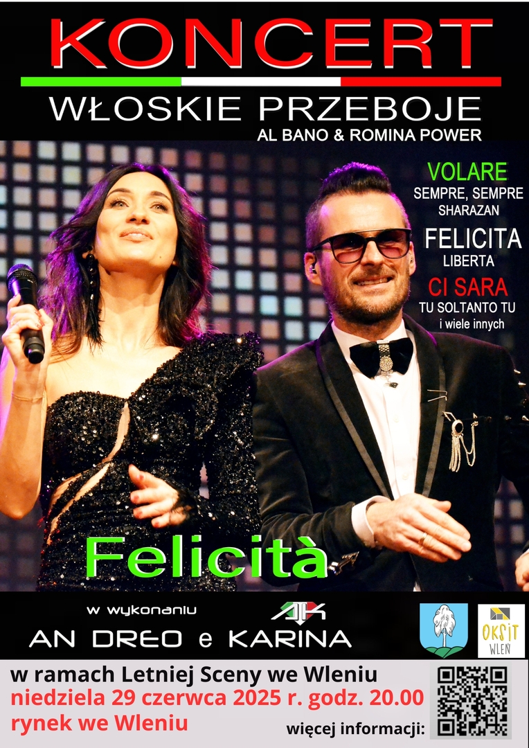 Serdecznie zapraszamy na wyjątkowy koncert zespołu muzycznego An Dreo e Karina, który w niedzielę 29 czerwca 2025 r. wykona na wleńskim rynku największe włoskie przeboje duetu Al Bano & Romina Power. Koncert wraz z wydarzeniami towarzyszącymi i atrakcjami dla najmłodszych, o których będziemy informować w kolejnych publikacjach, otworzy cykl Sceny Letniej we Wleniu.