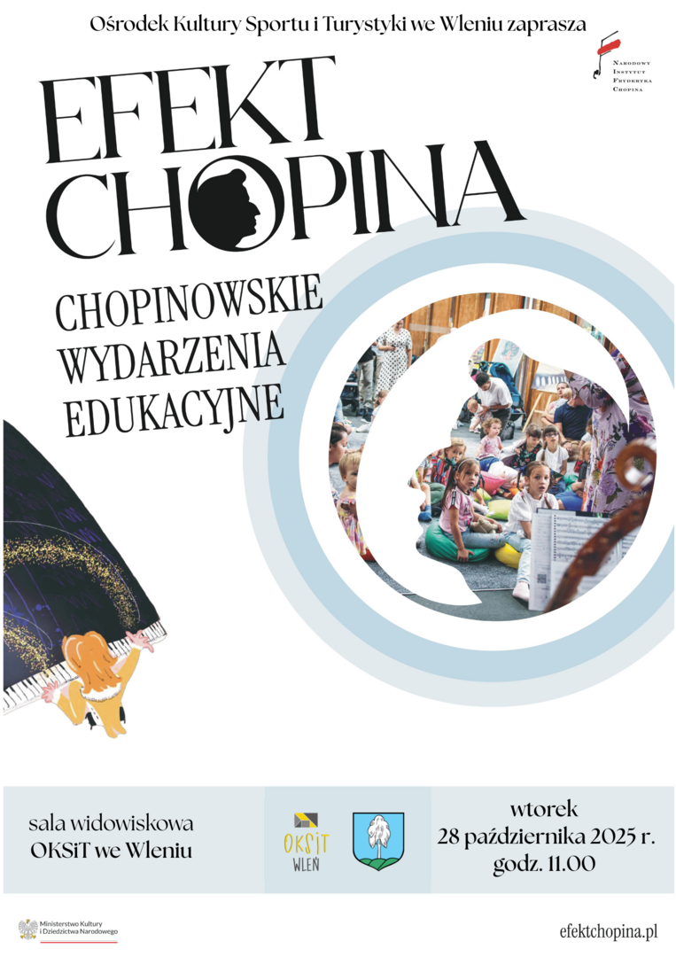 Serdecznie zapraszamy do Ośrodka Kultury Sportu i Turystyki we Wleniu na muzyczne wydarzenie, które odbędzie się we wtorek 28 października br. w ramach programu „Efekt Chopina”. Realizatorem projektu jest Narodowy Instytut Fryderyka Chopina. Koncert oraz wydarzenie artystyczne inspirowane twórczością polskiego kompozytora kierowane są do dzieci i młodzieży.