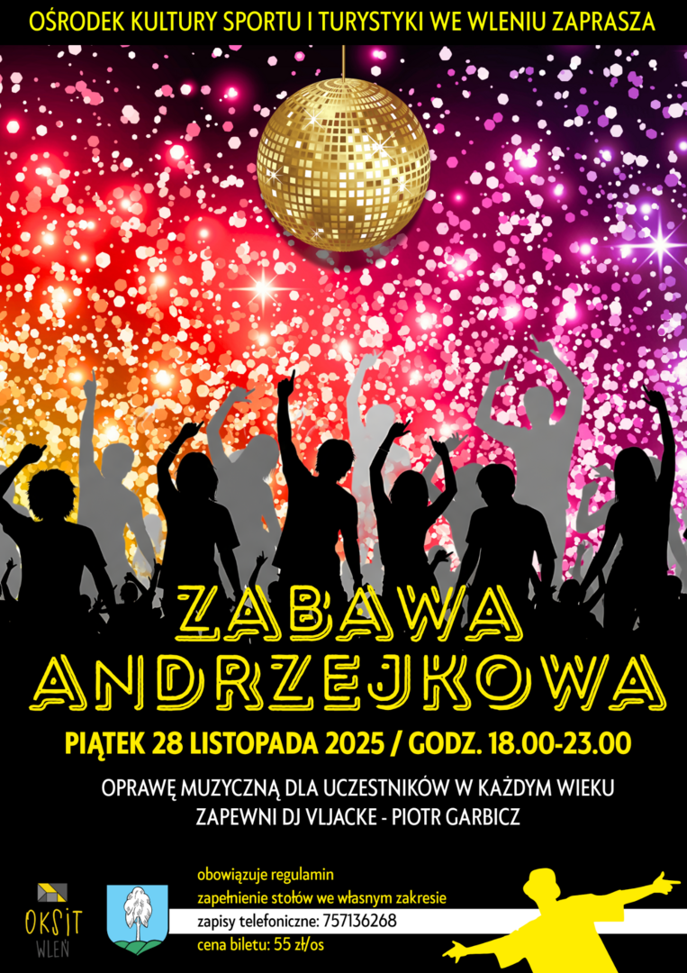Serdecznie zapraszamy na Zabawę Andrzejkową, która odbędzie się w piątek 28 listopada 2025 r. w Ośrodku Kultury, Sportu i Turystyki we Wleniu. To doskonała okazja dla wszystkich, którzy lubią dobrą muzykę i taneczną atmosferę. Wydarzenie jest propozycją dla osób pełnoletnich, spragnionych świetnej zabawy.